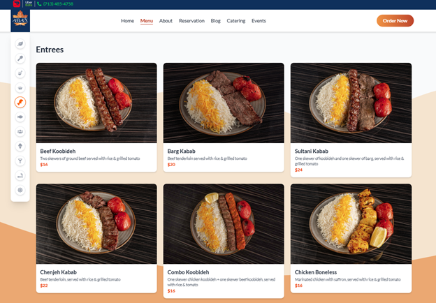 - Traditional Kabobs: Barg, Soltani, Koobideh, Shishlik, and Chicken Kabob